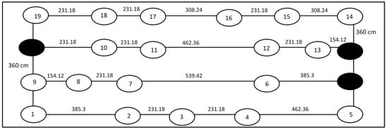 The calculation of the shortest path for order pickers involved all aisles that contain items that have been ordered by the customers. Based on the items according to Figure 3, the distance and sequence matrix are built. As mentioned earlier, for the purpose of understanding the Floyd–Warshall algorithm, only a small sample of nine nodes are selected. These nodes are calculated manually in order to gain a deeper knowledge of the algorithm. The process of obtaining the shortest path and distance matrix is the same throughout the whole data of 19 nodes (n = 19).