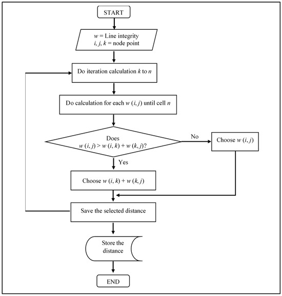 Equation (3) represents the determination of the shortest distance matrix using the Floyd–Warshall algorithm. From the formula, refers to the distance while and represent the two locations or nodes.