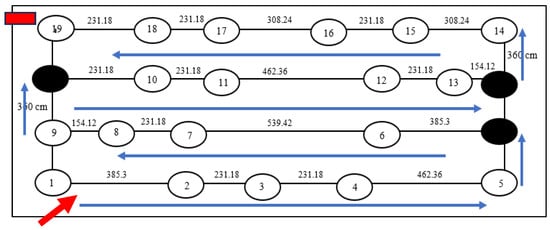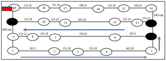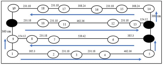 Thus, from the findings, is chosen as the shortest distance from node 1 to node 9. The same process is repeated to find and . For later cases where n = 19, the same process is repeated until all nodes have been processed. The detail for the calculation of n = 19 is explained in the next paragraph. Thus, for n = 9, the shortest path is obtained via 1→2→3→4→5→6→7→8→9 with the total distance of 29.8 km. The suggested path is shown in Figure 7.