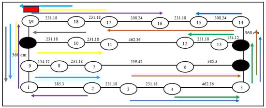 There are many possible shortest paths given by the software for the final solution of n = 19. Firstly, the order picker needs to identify the first node to be visited. Then, the picker will continue picking until all the items have been collected. The items collected will be based on the suggested routes from the TORA software and by considering the limited items to be carried out by each picker. Next, Figure 6 shows the result for the large data set, n = 19, which is 1-2-3-4-5-6-7-8-9-10-11-12-13-14-15-16-17-18-19 with 39.3821 kilometres (km).