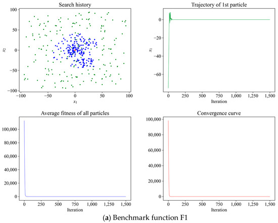 In order to conduct a qualitative analysis of the solving performance of VN-IPSO, we analyze four well-known indicators in the field: search history (population position change), the movement trajectory of the first particle, the average fitness of the population, and the best fitness value of the population. By recording the initial state, intermediate state, and final state of the population, the search calendar shows the position changes of all particles in the population in the iterative process and can reflect the movement trend of the population. The trajectory of the first particle is monitored by recording the change in the first one-dimensional variable of the first particle in the iterative process. The average fitness of the population was recorded in each generation to reflect the overall quality change and population stability. The best fitness value of the population reflects the convergence of the algorithm by recording the best fitness value in each generation.