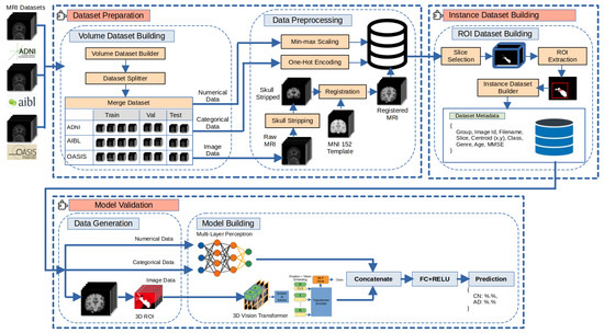 As illustrated in Figure 1, our methodology begins with data preparation, which includes splitting the dataset into training, validation, and test sets and preprocessing the images to remove non-informative content and align them properly. Next, the instance selection method identifies slices containing the defined ROIs and, based on the statistical mode, determines the centroid position (x, y). Finally, the proposed model is validated by generating batch data for training and testing diverse transformer-based classification models. This phase integrates multiple inputs by combining image data from different ROIs and mixed data.