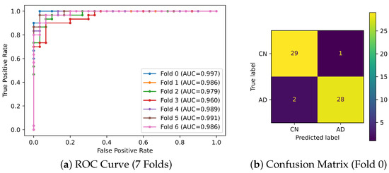The ROC curves and AUC values in Figure 4a demonstrate the effectiveness of the proposed Multiple Inputs and Mixed Data 3D Vision Transformer. The high average AUC value across 7-folds () reflects the outstanding model performance and a solid capability to differentiate between CN and AD classes. The confusion matrix shown in Figure 4b indicates that the model performs well, accurately predicting most cases with minimal errors, reflecting its effectiveness in distinguishing between the CN and AD classes.