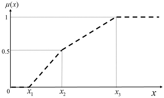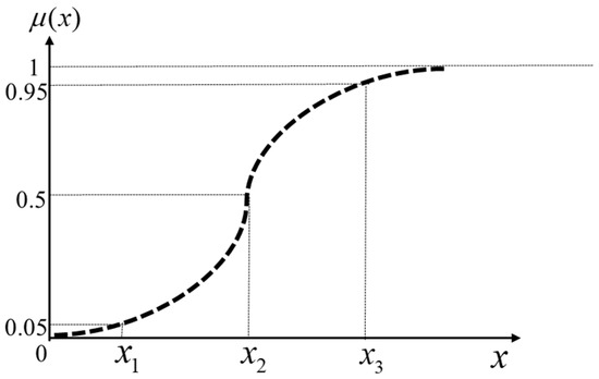 Second, the original data (outcome and conditions) must be treated as fuzzy sets, and the membership functions for all of them must be determined (calibrating the fuzzy sets). Calibration is a critical step because its results are used in the rest of fsQCA. The direct method is the most used and recommended calibration method [68]. In this method, the fsQCA practitioners specify three breakpoints that structure the fuzzy membership scores: fully in or fully out of the set and the point of maximum ambiguity (crossover point, ) [69]. The use of these three breakpoints results in the following S-shaped membership function, (see Figure 3):