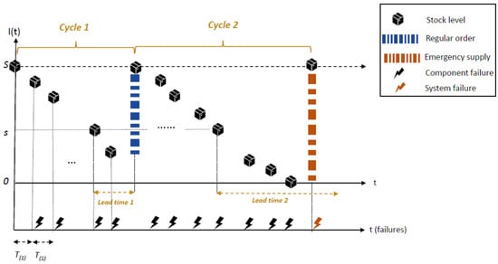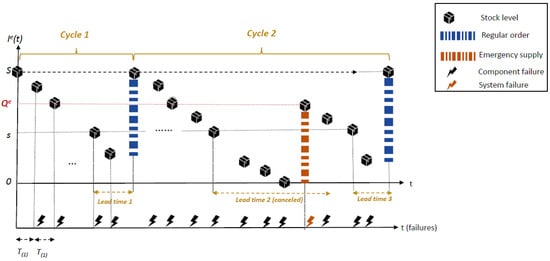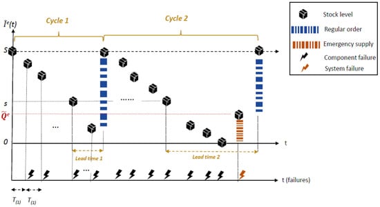 - The policy, . Here, we extend the above policy and consider a smaller emergency order. Specifically, when drops to level s, a regular order is placed. However, if during the lead time a component fails and no new components are available in the warehouse, an immediate and expensive emergency order of size () is placed, and the regular order is canceled. Whenever the stock drops to level s again, a new (regular) order is placed.