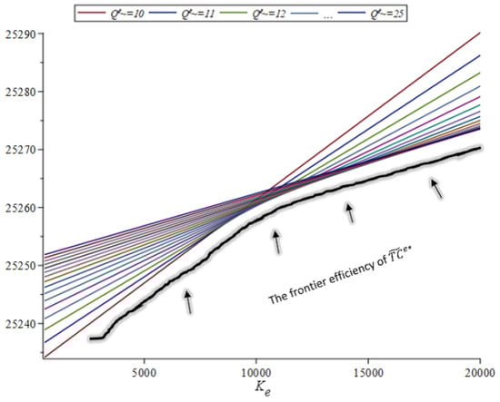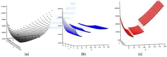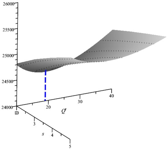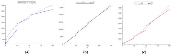 - Warehouse cost. Let be the cost of maintaining the warehouse. Since the warehouse capacity is limited to S components, the cost is typically assumed to be proportional to S. There are several functions that are used to express the warehouse cost. Here, we consider two of them: a discrete piecewise function and a continuous power utility function. As for the discrete piecewise function, we assume that has the form where and are step functions. Piecewise functions are well motivated in practice and in theory; see, e.g., [66,67,68,69]. As for the continuous power utility function, we assume the form Power utility functions are widely used in stochastic inventory management due to their general structure; see, e.g., [70,71]. We further let be the maintenance cost of the warehouse at time .