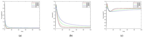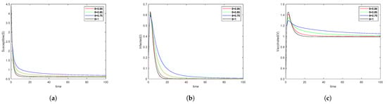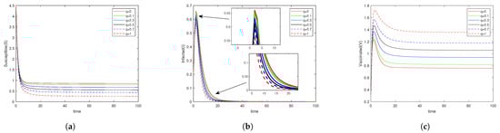 Figure 3 confirms that when , which corresponds to , the endemic equilibrium point is locally asymptotically stable. For the infected compartment, especially in the endemic state, as depicted in Figure 3b, a reduction in the value of leads to an enhancement in the system’s memory capacity, subsequently causing a deceleration in the rate of convergence. This means that it takes longer to eliminate the disease. Figure 4 illustrates the impact of the vaccination ratio q for newborns on the model. Here comes an interesting finding: the change in q significantly affects the variations in S and V. When the vaccination ratio escalates, the quantity of S diminishes, whereas the count of V augments. However, the change in q has a minor effect on I. This is because by analyzing the expression of , we can see that a higher q leads to a lower value of , making the disease more controllable.