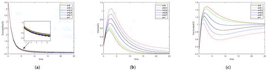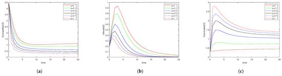 Figure 5 demonstrates the influence of the vaccination ratio p among the susceptible population on the model. Clearly, when the p value decreases, infections accumulate at a gradual pace, eventually contributing to the widespread dissemination of the disease and its evolution into an endemic state. Figure 6 shows the effect of vaccine effectiveness on the model. A higher value of indicates lower vaccine effectiveness. It can be observed that the level of vaccine effectiveness has a significant impact on both the infected population and the vaccinated population. Higher effectiveness leads to a lower peak of infection, and the disease eventually subsides, along with a reduction in the number of vaccinations, thus saving on vaccination costs.