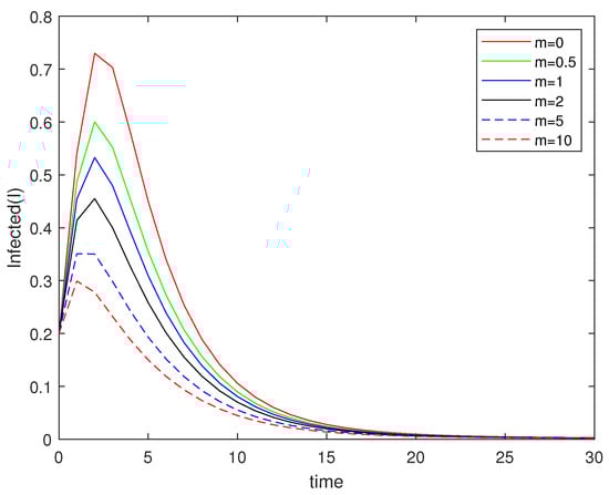 It should be noted that is independent of m, so it does not alter the stability at the equilibrium point, which is evident in Figure 7. Although m changes the peak value of I, it does not alter its equilibrium state.