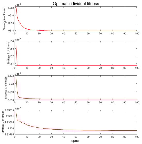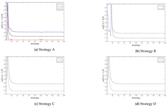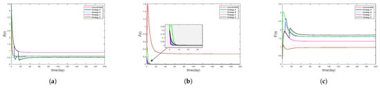 Figure 8 illustrates the variation in the objective function in the four strategies. It is evident that strategy A yields the most effective control outcome. Figure 9 depicts the curves of the control variables varying with time under different control strategies. Moreover, as seen in Figure 9a, for control strategy A, control measure should be implemented on a large scale in the initial days and then stopped after 13 days. Control measure needs to maintain the control intensity at around 0.213 after the 22nd day, while control measure should maintain the control intensity at approximately 0.096 after the 37th day. Figure 9b illustrates that when contrasted with control strategy A, although the final control intensities are not significantly different, the peak intensity of control measure in strategy B lasts for approximately 13 days. As seen in Figure 9c, in comparison to strategy A, the control measures and in strategy C have both increased in terms of time and control intensity. Figure 9d indicates that the control measures and in strategy D have also increased in terms of duration and the strength of control applied; however, the rise is not as significant as in control strategy C. As a result, the influence of the control measure surpasses that of in terms of effectiveness.