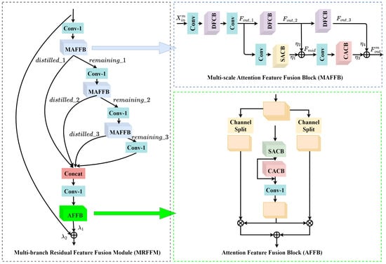 Multi-Branch Residual Feature Fusion Module (MRFFM): In the MRFFM, as shown in Figure 2, the features undergo a sequence of three channel splitting operations, each resulting in two branches. One branch retains its feature, while the other is forwarded to the subsequent layer for additional feature extraction via convolution and MAFFB operations. A convolutional layer is integrated into the distillation connection segment to augment the dimensionality of the split channels. Subsequently, the features preserved post-split are concatenated and fused and then passed into the AFFB module. The AFFB module combines elements from both the SACB and CACB, as depicted in the figure. Initially, the original input undergoes channel operation splitting, followed by concatenating and fusing the features extracted by the SACB and CACB modules with the original features post-split. Finally, the weighted output is added. In the MRFFM, layered features from various residual branches are combined to integrate shallow and deep image features comprehensively. This method allows the model to concentrate effectively on important image features, increases the utilization of feature information, and enhances the restoration of intricate image details. We denote the input of the module as . The aforementioned operations can be expressed as
