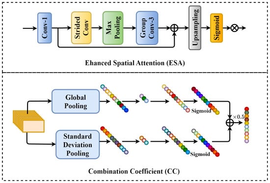 Dual Feature Calibration Block (DFCB): As illustrated in Figure 3, within the DFCB, the features produced by the upper and lower branches are initially weighted and merged using combination coefficients (CC) [32]. The CC structure, as depicted in Figure 4, employs an attention mechanism to generate weight coefficients for adaptive information selection. Subsequently, the features pass through the Enhanced Spatial Attention (ESA) module with combined coefficients. This process extracts spatial information again, followed by input to two pooling layers simultaneously. Dynamic weight values are then derived post-convolution and activation, multiplying them with the branch features. Finally, the output is added back to the initial input. Through adaptive weights, dual pooling layers, and dynamic adaptive weight integration, the DFCB module excels in extracting valuable feature information efficiently. We denote the input of the DFCB as , and the aforementioned process can be expressed as