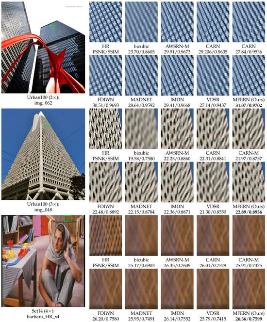 Upon closer examination of the resolution factor, we selected Urban100 (): img_062, where the reconfigured composition revealed a detailed texture. Despite minor blurring, the MFERN significantly outperformed the other methods in restoring the image textures. Similarly, at the resolution factor, we chose Urban100 (): img_048. The MFERN accurately restored the building’s exterior lines, enhancing the clarity. Notably, in Set14 (): barbara_HR_, focusing on the prominent texture details, such as the chair lines, the MFERN’s result closely resembled the HR image, while the other methods produced blurred results.