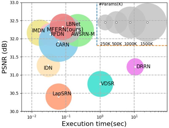 We comprehensively compared the model’s complexity with that of the existing methods, including the number of model parameters and computation, on the Set5 test set. Figure 7 shows the good balance of our MFERN with a small number of parameters and a fast execution time. It shows the efficiency and effectiveness of our model.