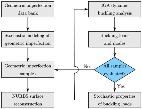 In this paper, we extend our previous work on the buckling analysis of isogeometric shell structures to the stochastic situation. In particular, a deterministic isogeometric dynamic buckling analysis approach combined with a spectral representation of random geometric imperfections is developed to study the stochastic dynamic buckling behaviors of cylindrical shell structures. For deterministic analysis, a modified Generalized-α time integration scheme combined with a nonlinear isogeometric Kirchhoff–Love shell element is used to simulate the buckling and post-buckling problems of cylindrical shell structures. The Generalized-α time integration scheme is second-order accurate and can dissipate high-frequency contents with less influence on the low-frequency contents. Therefore, it is a desirable time integration approach to dynamic buckling analysis. To incorporate the geometric imperfections, an NURBS surface reconstruction method is developed to model the measured geometric imperfection data of the cylindrical shell. Then, the reconstructed model can be naturally incorporated into the isogeometric framework due to the seamless integration of CAD and CAE models inherited in IGA. Additionally, the smooth and high-order continuous geometric representation naturally eliminates the artificial geometric imperfections caused by finite element meshes. This property may improve the prediction accuracy and computational efficiency in dynamic buckling problems. For stochastic analysis, the method of separation is adopted to model the stochastic geometric imperfections of cylindrical shells based on a set of measurements. Then, an arbitrary number of samples can be generated to evaluate the stochastic dynamic buckling behaviors of cylindrical shells. For comparison, the stochastic buckling behaviors of cylindrical shells under static loads are also studied, different features obtained by static and dynamic analysis are highlighted, and suggestions are made for the design of this type of shell structure. To better illustrate the method used in this paper, a flowchart of the proposed approach is shown in Figure 1.