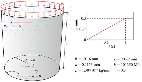 In this example, a cylindrical shell denoted as A9 with measured geometric imperfections is considered to test the accuracy of the proposed isogeometric method for dynamic buckling analysis. The geometric descriptions and material properties are shown in Figure 2. The upper and lower rims of the cylindrical shell are simply supported, except that the upper rim is subjected to a vertical displacement boundary condition with the velocity equal to 0.5mm/s. The boundary conditions can be expressed as follows: