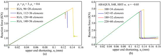Cylindrical shell A9 with measured geometric imperfections: (a) convergence of IGA model, (b) convergence of ABAQUS model.