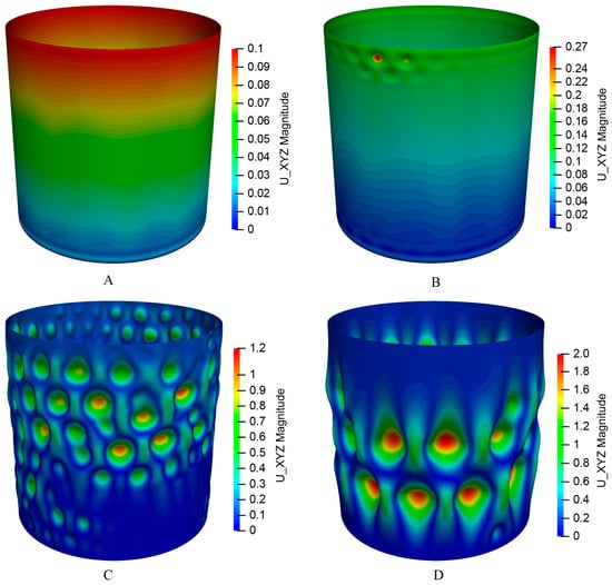 Contour plots of the cylindrical shell A9 during dynamic buckling analysis: (A) pre-buckling state, (B) initial buckling state, (C) post-buckling transition state, (D) post-buckling stable state.