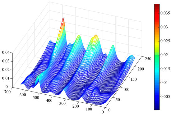 For the estimation of the geometric imperfection random field, we first determine the mean function of the measured imperfections . Then, a zero-mean ensemble of samples can be obtained as , which can be used for the estimation of the spectrum and spatial envelope. The cut-off frequencies are set to be , and the number of discrete frequencies in two directions are set to be N1 = N2 = 100.