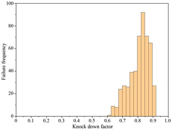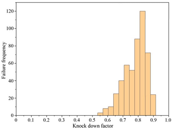 In this example, 500 geometric imperfection samples are generated and the corresponding shell models are simulated based on the proposed isogeometric dynamic buckling analysis framework. The boundary conditions are the same as in the example in Section 4.1. The buckling load variability of the cylindrical shell under dynamic load is shown in Figure 8, where the mean value of the knock down factor is 0.809, and the coefficient of variation is 8.2%. For comparison, the buckling load variability obtained with static nonlinear arc-length method is shown in Figure 9, where the mean value of the buckling load knock down factor is 0.782 and the coefficient of variation is 9.4%. We note that the knock down factor is the buckling load normalized with respect to the theoretical buckling load of the cylindrical shell; see Equation (45). It can be observed from Figure 8 and Figure 9 that the mean value for the buckling load obtained with dynamic analysis is slightly higher than with static nonlinear analysis, which might be due to the dynamic effects of the applied impulse load. Moreover, the variability in the dynamic buckling load is smaller than the static buckling load, which means that the dispersion degree of dynamic buckling loads is lower than the static case. This observation signifies that the cylindrical shell structures are less sensitive to variations in the geometric imperfections in the dynamic situation, which might be caused by the interaction between the geometric imperfection and the vibration modes.