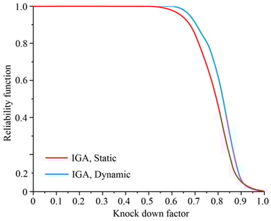 Figure 10 shows the reliability functions of the knock down factor for both dynamic and static buckling analysis. This can be used to design cylindrical shell structures under buckling constraints with a desired level of confidence. The reliability of the shell structure under a buckling situation will decrease when the designed buckling load increases. Moreover, this also shows that the reliability of the cylindrical shell under a dynamic buckling load is slightly higher than that under a static buckling load. The above observations suggest potential improvements in designing cylindrical shell structures under dynamic loads.