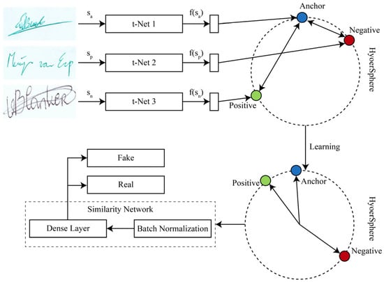 The tSSN consisted of three identical subnets. The configuration of the three CNNs was identical, with the same configuration combined with a distance metric. In the training process, there were three signatures in a data instance: anchor (S), positive (S+), and negative (S−), where the anchor and positive signatures were the original signatures of a person, whereas negative signatures were his forged signatures. The triplet signatures was input through t-similarly based CNN, which converted these signatures into an embedding space through the dense layer of t-Siamese CNN. In this triplet structure, signatures from different classes were expected to be grouped into tightly well-separated clusters. The tSSN had a t-Net that sequentially extracted features of images. The Euclidian distance metric can be used to measure the distance between and can be computed as