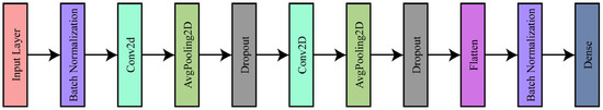 The proposed CNN was a lightweight architecture comprising 10 layers, as illustrated in Figure 3. It included two convolutional layers, a batch normalization layer, an average pooling layer, a dropout layer, a flatten layer, and a fully connected dense layer. The convolutional layers performed feature extraction by convolving a weighted kernel. Non-linearity in the feature map was introduced through the application of a nonlinear layer. The pooling layer reduced the spatial resolution by replacing neighborhoods with their statistical information. Each layer of the CNN established a local connection between the input and the output. The ReLU activation function was employed throughout the CNN architecture. Padding for each layer was set to ‘valid’. Additionally, each convolutional layer block was followed by an average pooling layer with a stride of 2.