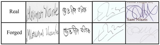 For experimentation, five different datasets were used, which included the BHSig260, SigComp2011, 4NSigComp2010, 4NSigComp2012, and CEDAR datasets. The distribution of the training and testing dataset was 60:40 throughout our experiments. The BHsig260 signature dataset consists of the signatures of 260 people, which are a mixture of Hindi and Bengali signatures. It has 100 Bengali signatures and 160 Hindi signatures. SigComp2011 was published at the ICDAR 2011 conference for the International Signature Verification Competition (SVC) [21]. The dataset contains both Chinese and Dutch authors. The 4NSigComp2010 dataset contains images of offline signatures [22]. The education signature collection contains 209 images. It has 9 actual signatures and 200 forged signatures from the same author. The 4NSigComp2012 dataset’s training set is comprised of the training and test sets of 4NsigComp2012 [23]. It contains the signatures of two writers as examples. It has the same configuration as 4NSigComp2010. The CEDAR dataset comprises 55 English signatures, of which half are forged samples and half are genuine signatures of each person [24]. The samples of signatures are given in Figure 4.