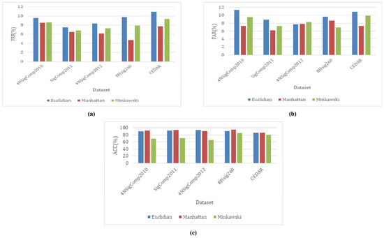 The Minkowski with p = 3 is the generalized form of Euclidian and Manhattan distance measure techniques. The proposed methodology has been tested on five datasets using different distance measure techniques and accuracy; FAR and FRR values are shown in Figure 7. The results of Manhattan were better as compared to the Euclidian distance and Minkowski distance measure techniques.