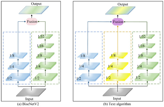 The network structure of the BiseNetV2 algorithm and the proposed algorithm is illustrated in Figure 1. Figure 1a depicts the BiseNetV2 algorithm, while Figure 1b illustrates the enhanced proposed algorithm, which is based on BiseNetV2.