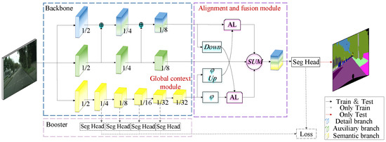 Finally, since the semantic branch of BiseNetV2 in the network aims to capture global context information and extract high-level semantic features, it needs to be further improved to enhance the model’s ability to extract high-level semantic features. To solve the above problems, this paper optimizes BiseNetV2 to improve the performance of the algorithm. The main contributions of this paper are summarized as follows: (1) auxiliary branches are designed to guide detailed branches to capture long-distance relationships between features, further increasing the segmentation performance of large irregular targets; (2) an alignment and integration module (alignment-and-fusion module—AAFM) is proposed to merge multiple output branches of the model in the implementation of the effective interaction between multiple branches at the same time, which eases the characteristics of non-alignment problems, making up for the loss of small target information; (3) a global context module (GCM) is introduced to capture the most important features in the input data, thereby improving the model’s awareness of key information; and (4) the performance of the proposed algorithm on Cityscapes and CamVid datasets is significantly improved compared to the BiseNetV2 algorithm and other existing advanced algorithms, proving the superiority of the proposed algorithm.