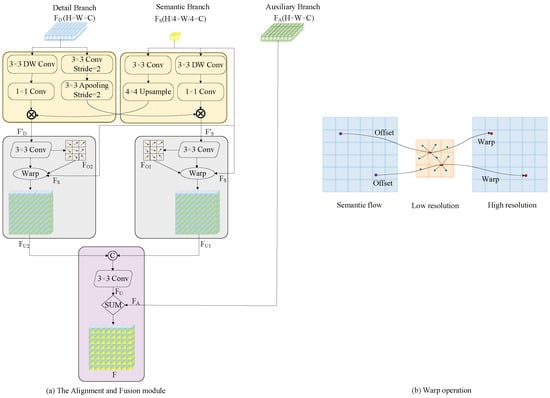 where represents the input of this module, represents detail branch, semantic branch and auxiliary branch, respectively; represents the convolution operation m × n; and Apooling indicates average pooling operation. The Warp operation is shown in Figure 4b. ⊗ represents the multiplication-by-element operation.