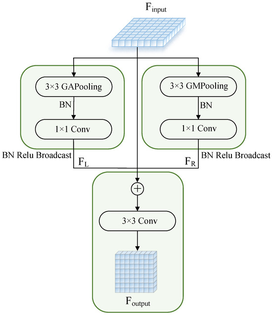 The module structure is illustrated in Figure 5. Firstly, the input feature, designated as , undergoes global average pooling and global maximum pooling, respectively. Subsequently, the two obtained feature maps are batch normalized, with the objective of stabilising the distribution of input features. Subsequently, in order to extract more effective features, a 1 × 1 convolution is employed to process them separately, with the objective of fusing features from different channels and thereby facilitating interaction between the features derived from different channels. Subsequently, the model’s expression ability was augmented through the incorporation of batch normalisation and a ReLU activation function, thereby yielding the requisite outputs, designated as and . Subsequently, the inputs, namely , , and , are merged through the utilisation of skip connections, thereby facilitating the direct transfer of information pertaining to the input features to and . This approach serves to achieve a harmonious equilibrium between the processing of intricate details and the integration of global information. Finally, in order to more accurately represent the semantic information present in the image, a 3 × 3 convolution is performed to further enhance the model’s ability to abstract and obtain the final output, denoted as . The aforementioned operations can be expressed as follows: