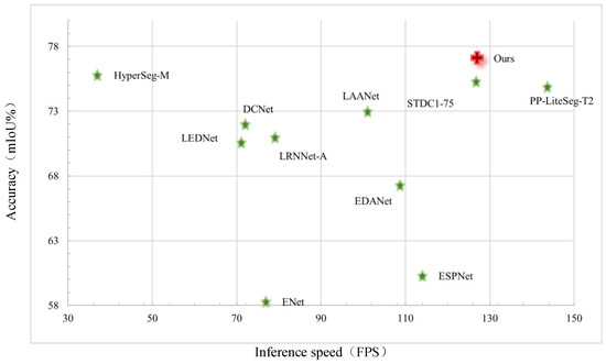 To illustrate the analysis results in a more direct manner, the paper also presents a scatterplot of the precision-speed comparison based on Cityscapes validation set, as shown in Figure 6. This includes 10 classical algorithms that differ from those presented in Table 3. It can be observed that the algorithm presented in this paper is situated in the upper right quadrant of the image. It exhibits superior segmentation accuracy in comparison to other lightweight semantic segmentation networks, while also maintaining a high level of processing speed. This demonstrates that the proposed algorithm strikes an optimal balance between accuracy and real-time performance.