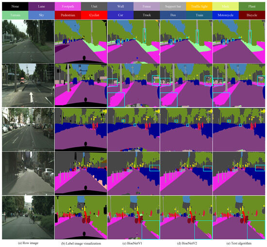 In order to demonstrate the efficiency of the proposed algorithm in terms of segmentation, partial visualisation results and partial error graphs for the proposed algorithm and the BiseNetV1 and BiseNetV2 algorithms are presented in Figure 7 and Figure 8, respectively. Figure 7 illustrates the input image (Figure 7a), the label image (Figure 7b) provides a visual representation of the dataset segmentation results, and the semantic segmentation results of the BiseNetV1 (Figure 7c) and BiseNetV2 (Figure 7d) algorithms. Figure 7e illustrates the semantic segmentation results of the proposed algorithm. The different colours represent different categories and the blue boxes indicate the different segmentation results produced by the three calculations. As illustrated in Figure 7, the boundaries of the segmentation results for objects of a smaller scale, such as poles and traffic signs, appear blurred in both the first and third lines. Additionally, there is a notable absence of main body segmentation for poles. However, in this algorithm, the contours are complete and the boundaries are clearer and smoother. In the second and fifth lines, for categories with high frequency and large scale, such as fences and roads, the algorithm in this paper demonstrates superior performance in segmenting roadside fences and achieving complete ground segmentation. In the initial, fourth, and fifth lines, the model in this paper is able to distinguish between the target person and the vehicle with a high degree of accuracy, and the outline boundary is clearly delineated.