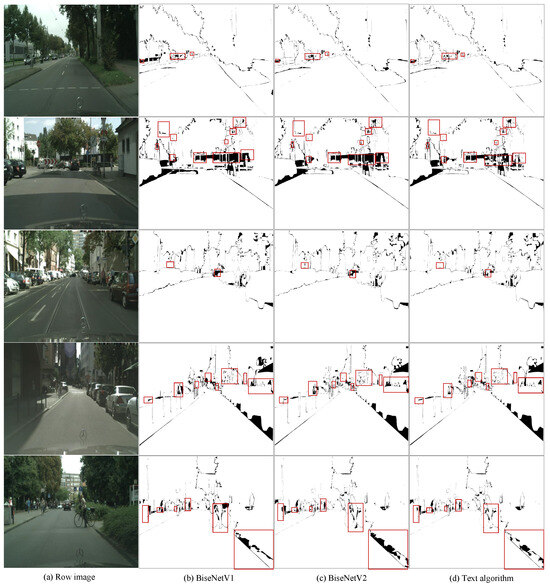 Figure 8 illustrates the input image (Figure 8a), the segmentation error diagram of BiseNetV1 (Figure 8b), the segmentation error diagram of BiseNetV2 (Figure 8c), and the segmentation error diagram of the algorithm proposed in this paper (Figure 8d). The white area denotes an accurate classification, whereas the black area represents an erroneous classification. A comparison of the proportion of black and white areas in the red box and the input image reveals that the target shape is significantly more discernible and the boundary is markedly smoother following the addition of the module proposed in this paper. Furthermore, the segmentation result is notably more refined.