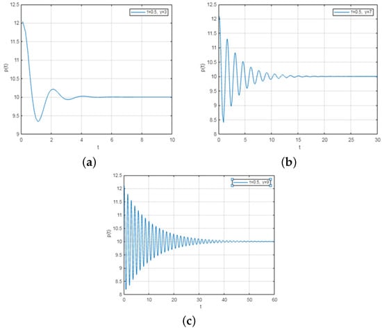 Dynamics of market price with different intensities. (a) Shows that the price will oscillate less with an elasticity coefficient equal to 3. (b) Shows that the price will fluctuate more with an elasticity coefficient equal to 7. (c) Shows that the price is stable when the elasticity of demand is 7, but more oscillating.