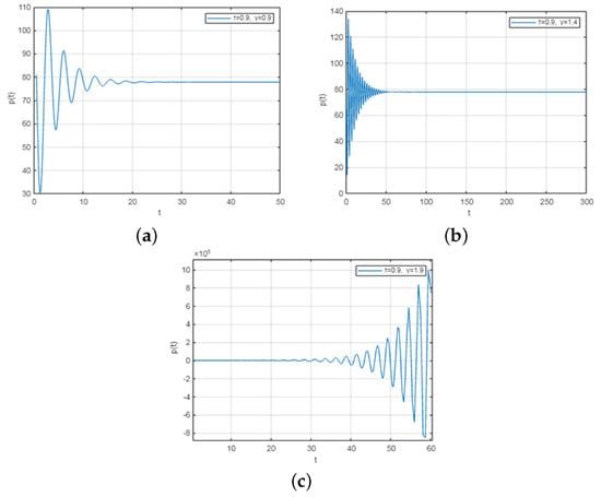 When the coefficient of elasticity of demand is equal to 0.9, we have a small fluctuation (Figure 2a) because the demand is inelastic (buyers will not react much to the change in the price of the product). As the coefficient values increase, the oscillation interval also increases (Figure 2b). The third graph (Figure 2c) shows a pattern with a demand elasticity coefficient of 1.9, a coefficient in this case indicating that demand is flexible (i.e, buyers will be very responsive to a change in price). In this case, the system is asymptotically unstable and we cannot analyze when the market price will reach the equilibrium point. All presented results were calculated using the Lambert W function method and compared with the numerical method dde23 from the Matlab package.