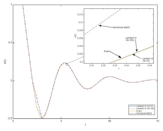 A number of branches of the Lambert W function equal to 80 was used during the experiment. The larger the number of branches of the Lambert function that is chosen, the more accurate the result is. To be more accurate than the numerical method dde23, it is enough to select 80 branches (the chosen number of branches is based on the analysis performed in the article [15,26]). The Lambert W function method is close to the exact Consequent integration method and is therefore superior to the dde23 method (a more detailed comparative analysis of the methods can be found in articles [15,26]).