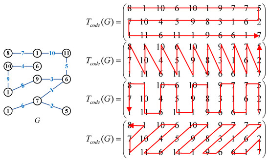 The topological coding matrix proposed by Yao et al. [7] refers to the arrangement of all labels of the vertices and edges of a graph with p vertices and q edges according to the following: , , and , where distributes us at least different number strings in total. Figure 2 shows a simple example of generating different number strings from a adjacency matrix to derive number strings in a similar way to a topological coding matrix. The four number strings shown below can be generated according to Figure 2, though of course there are many other ways to export a number string: