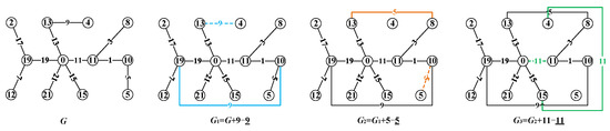 (2) If m is not the vertex of a leaf, let ; if its k adjacent edges do not contain an edge labeled 1 and , then its adjacent edge in can be obtained by G through k randomly adding edge-removing operations, causing m to become an isolated vertex. □