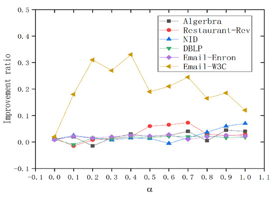 We first verify the impact of the hyperedge influence ratio on the final information propagation results. Figure 2 depicts the impact of hyperedge influence ratio on the improvement ratio. We can observe that the hyperedge influence ratio can improve the propagation effect of seed nodes. In the first five datasets, the improvement ratio shows an overall upward trend with the increase in the hyperedge influence ratio. That is, hyperedge influence has a positive effect on information propagation, and the increase in hyperedge influence ratio is correlated with the overall activity of the network. When the influence of hyperedges on nodes increases, the information flow and interactivity of the entire network may be enhanced, thereby promoting more efficient information propagation. In addition, this trend also reveals the importance of hyperedges in higher-order network structures and their potential role in promoting information propagation.