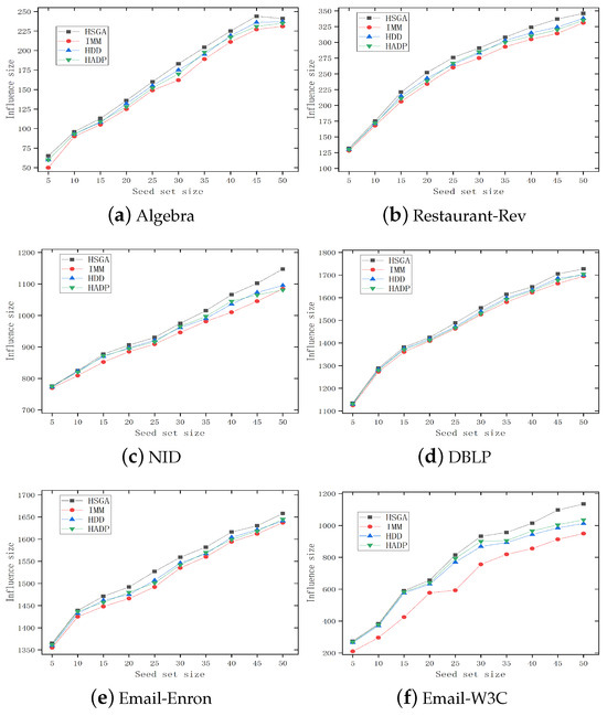 Figure 3 depicts the trend of the influence range of different influence maximization algorithms under different numbers of seed nodes. We can observe that as the number of seed nodes increases, the influence range on each dataset shows an increasing trend, and the increasing trend and influence range differ depending on network data and structure. The HSGA exhibits better performance than the other influence maximization algorithms. As the number of seed nodes increases, the difference between the two algorithms tends to increase. It indicates that when the number of active nodes in the network increases, the information propagation model based on hypergraph can reach a wider range of nodes, thereby having greater propagation potential.