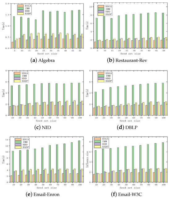 Figure 4 depicts the comparison of the running time spent by different influence maximization algorithms in selecting the same number of seed nodes on six different datasets. It can be observed that the running time of the HSGA is significantly smaller than those of the comparison algorithms on six datasets. This is because the HSGA adopts the Monte Carlo method and random walk sampling method to reuse the results, significantly improving the computational efficiency of selecting seed nodes, thereby shortening the overall running time and achieving relatively stable performance in different social networks. In the case of approximating the influence results, the HSGA has a shorter running time and can effectively improve the efficiency of the influence maximization method.