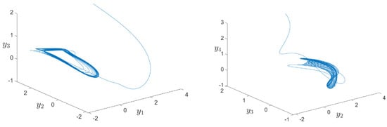 When the initial state is and fractional order is chosen, the financial system (25) exhibits a chaotic state, and the chaotic attractor is shown in Figure 2: