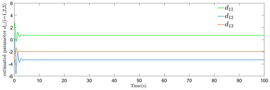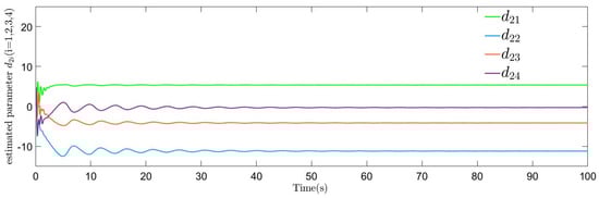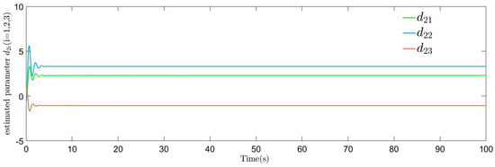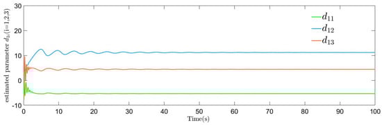 In Figure 7, Figure 8, Figure 9 and Figure 10, we observe that all the synchronization errors can converge to zero and all the controllers and the estimated parameters and are bounded, which means that we have successfully synchronized these two fractional-order chaotic systems using the controllers designed in the desired dimension. The simulation findings confirm the efficacy and correctness of the method outlined in Section 3 in tackling the synchronization problem between two bidirectionally coupled fractional-order chaotic systems that have unknown time-varying parameter disturbance across different dimensions.