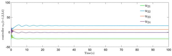 By MATLAB simulation, we can obtain the numerical curve of synchronization errors of system (27) with respect to the variables and . The curves of controller , estimated parameters , and estimated parameters are shown in Figure 7, Figure 8, Figure 9 and Figure 10, respectively.