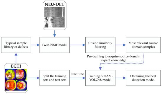 - After the source and target domain samples are reconstructed in the feature space by Twin-NMF, a source domain sample screening algorithm based on the cosine similarity is designed to further obtain the source domain samples that are most relevant to the target domain task. The knowledge transfer from the source domains NEU-DET and GC10-DET to the target domain ECTI is achieved by fine-tuning with pre-trained weights.