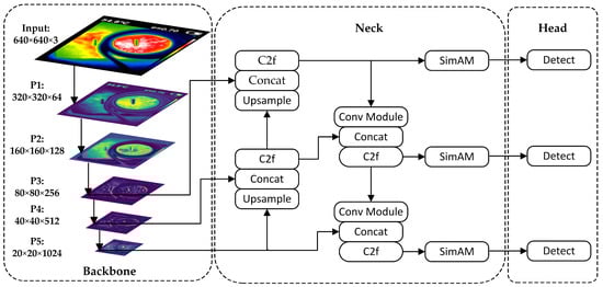 As a lightweight attention module that does not introduce additional parameters, SimAM is ideally suited for integration into the industrial inspection model discussed in this study. It effectively addresses the issue of multi-scale feature accuracy degradation observed in the model. This study enhances the sensitivity of YOLOv8 to multi-scale feature maps by incorporating the SimAM attention module at the neck of the model. The architecture of the enhanced SimAM-YOLOv8 model is illustrated in Figure 3.