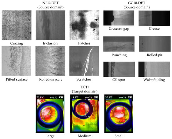 The NEU-DET dataset contains six types of surface defects of hot-rolled steel strip: including Crazing (Cr), Inclusion (In), Patches (Pa), Pitted Surface (Ps), Rolled-in Scale (RS), and Scratches (Sc), with a total of 1800 grey-scale images. The GC10-DET dataset contains 10 types of defects, with a total of 3570 images. The ECTI dataset contains three types of surface defects of steel plates captured by eddy current thermography: Small, Medium, and Large, which represent different sizes of crack defects, with a total of 1280 infrared images. Partial images from the dataset are illustrated in Figure 4: